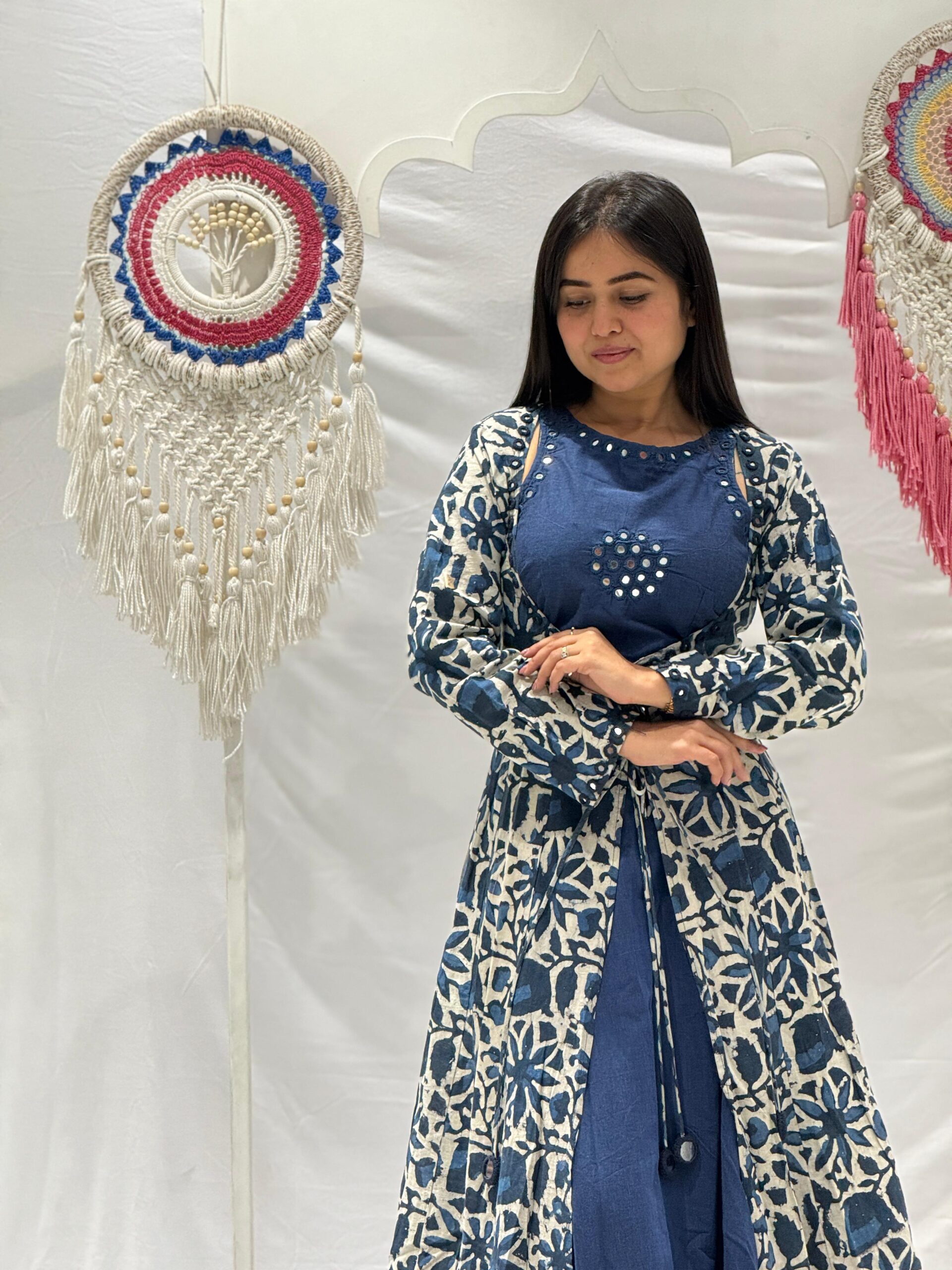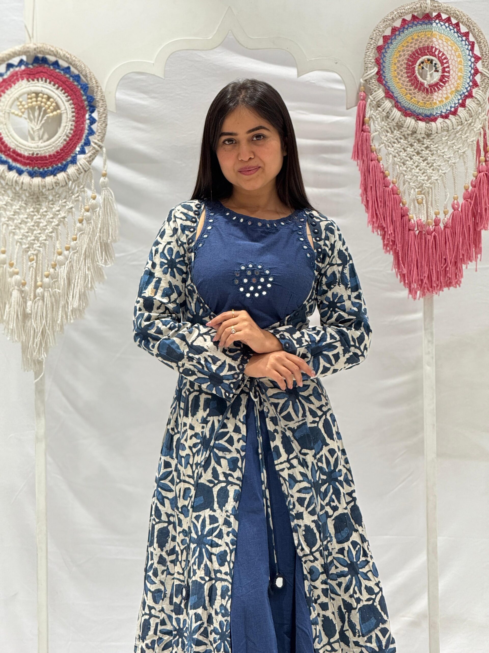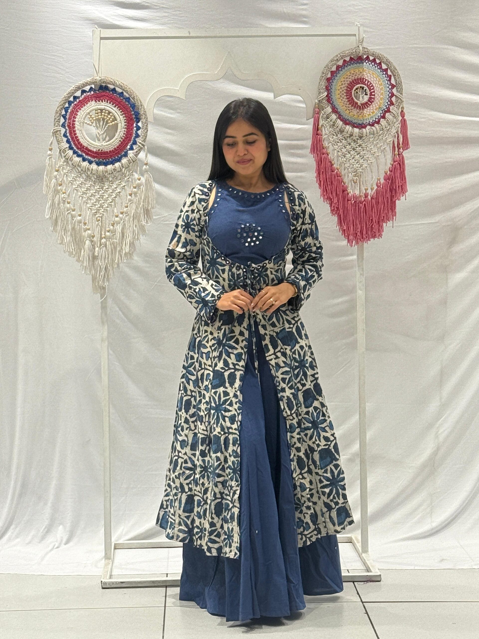 The set features a printed cotton long jacket, a chic crop top, and a flowy skirt, offering a complete Indo-Western look that is versatile for multiple occasions. The jacket comes with vibrant traditional prints inspired by Gujarati textile artistry, adding a cultural charm. Paired with a plain or embroidered crop top and a coordinating skirt, the outfit reflects effortless elegance with a modern twist.